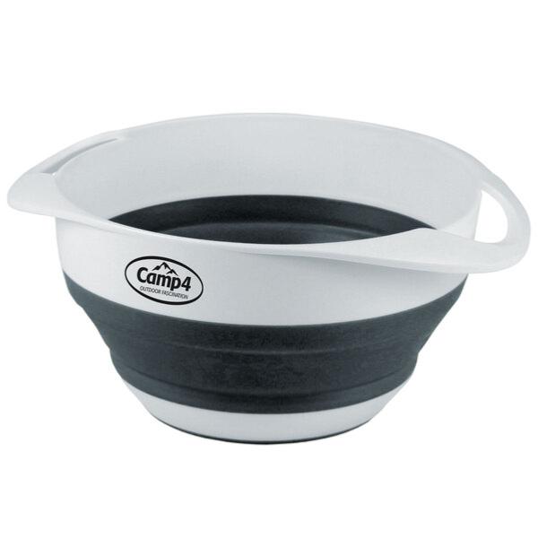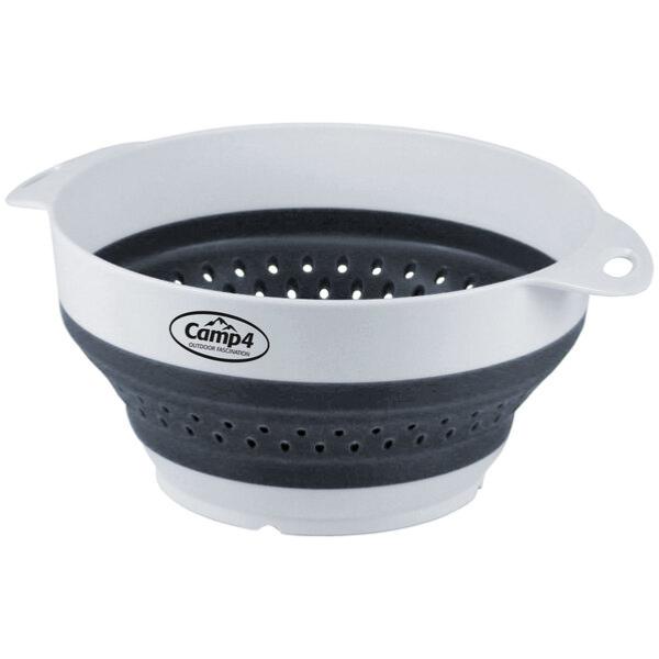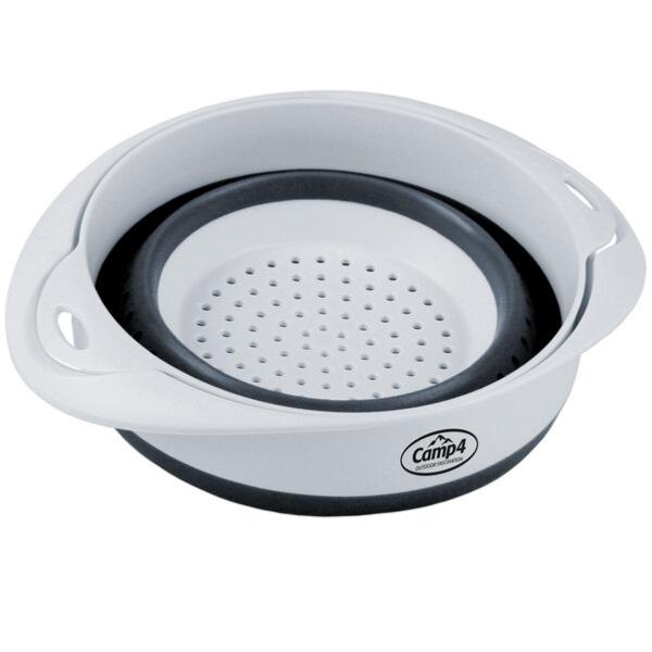 Bol pliable en silicone avec tamis pliable en silicone, chacun avec 2 poignées. Empilé l'un dans l'autre et replié, le bol avec tamis se range dans le camping-car ou la caravane pour gagner de la place. La nouvelle combinaison de couleurs blanc / gris anthracite fait briller vos fruits, légumes, etc.