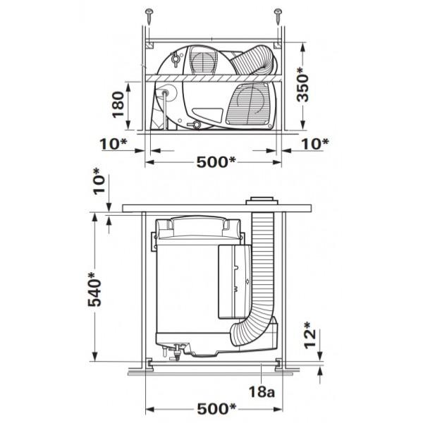 - Dimensions de montage (dimensions minimum : selon la situation de montage, prévoir de la place supplémentaire pour le raccordement au gaz, les raccordements d’eau et la soupape de vidange) (L x I x H) 540 x 500 x 350 mm