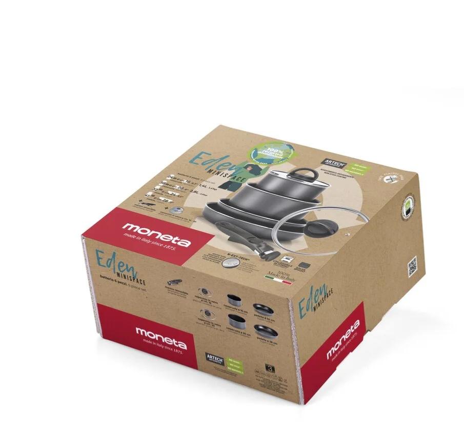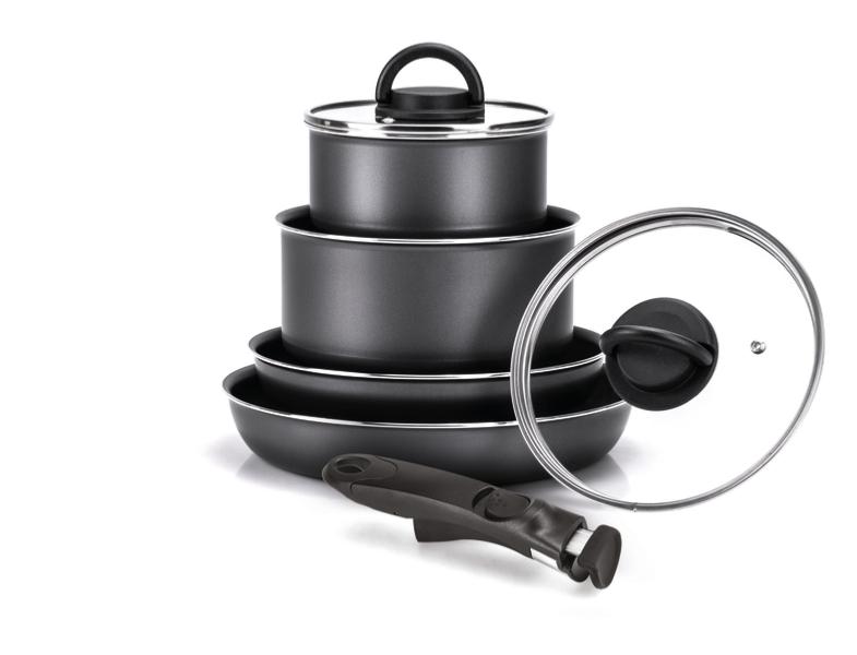 Ensemble composé de : casserole 16cm avec couvercle, casserole 20cm avec couvercle, poêle 24cm, poêle 28cm et poignée amovible.