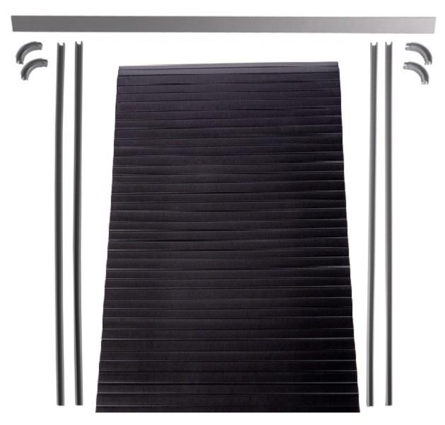 Le kit de volets roulants comprend des lattes PVC, un rideau Noir de 1 m x 60 cm coupable (dernière latte creuse pour poignée), 4 rails de guidage de 1 m, 4 angles de guidage 90°, un bandeau de finition supérieur et une fixation par vis non fournies 123.