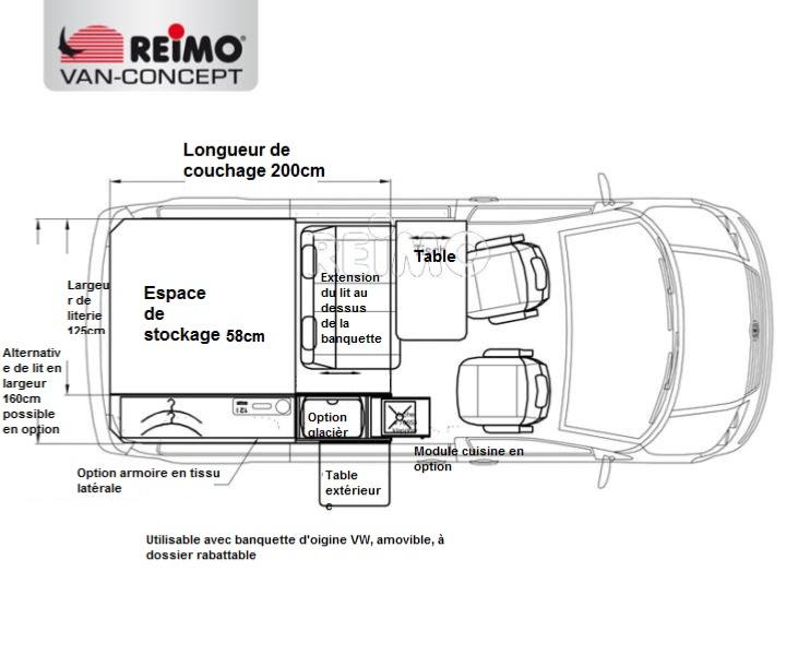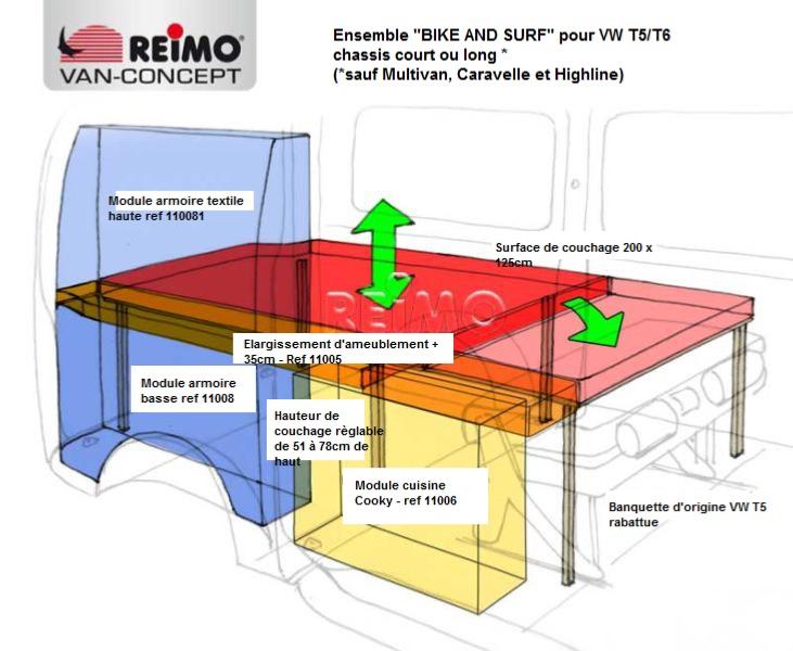 - Descriptif détaillé : le VW Transporter peut être transformé en une cellule dormante avec grand espace de rangement, canapé, table et boîte de cuisine en peu de temps, avec les composants du kit BIKE AND SURF de REIMO, nouvellement mis au point. Et cela aussi à un prix incroyablement bas et pour une installation facile.