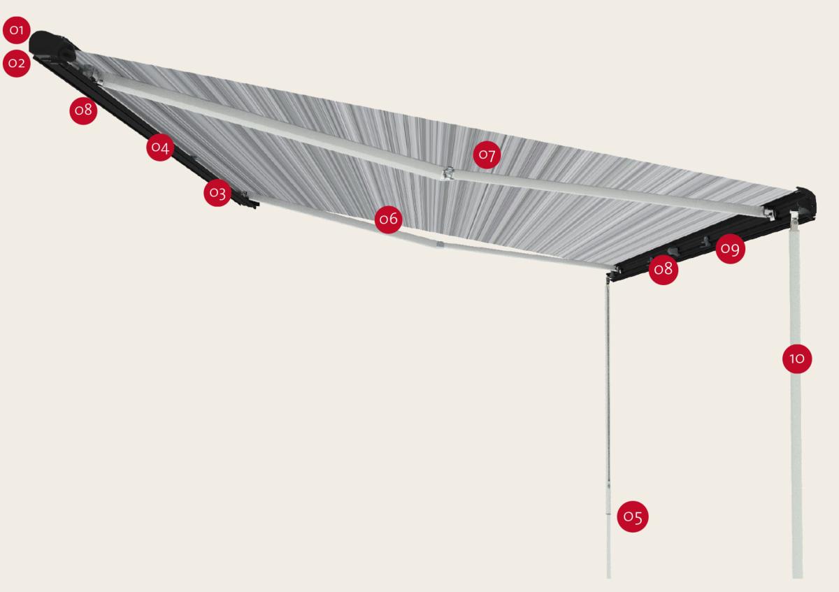 [6] Bras ultra résistants : bras renforcés et articulés à plus grande section avec double câble en acier pour une tension optimale de la toile