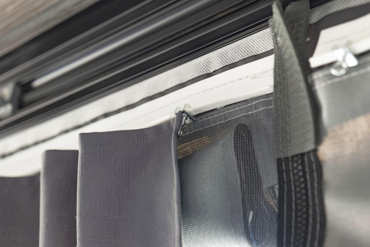 toutes les fenêtres disposent d’une baie Crystal enroulable, moustiquaire et rideaux de série