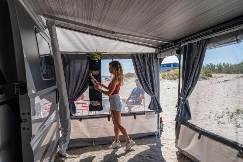 Nouveaux rideaux de couleur gris foncé pour les façades et côtés de l’auvent Privacy et pour les parois frontales Blocker Pro. Offrent une occultation complète, bloquent la lumière et garantissent ainsi une intimité absolue.